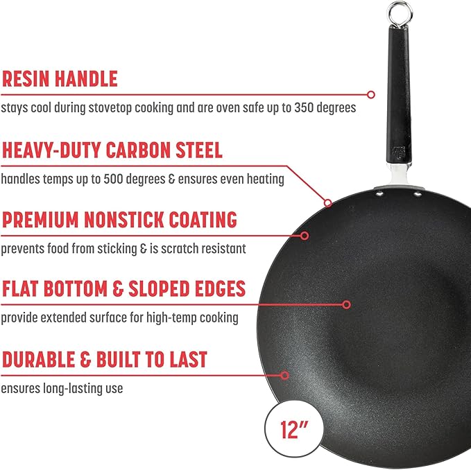 JOYCE CHEN Professional Series 12-Inch Carbon Steel Excalibur Nonstick Stir Fry Pan with Phenolic Handle