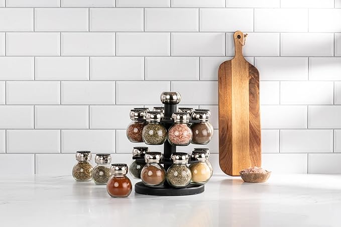 Olde Thompson Since 1944 Orbit Rotating Rack, 16 Refillable Spice Jars, Labeled Shaker Tops, 45, Black, Clear