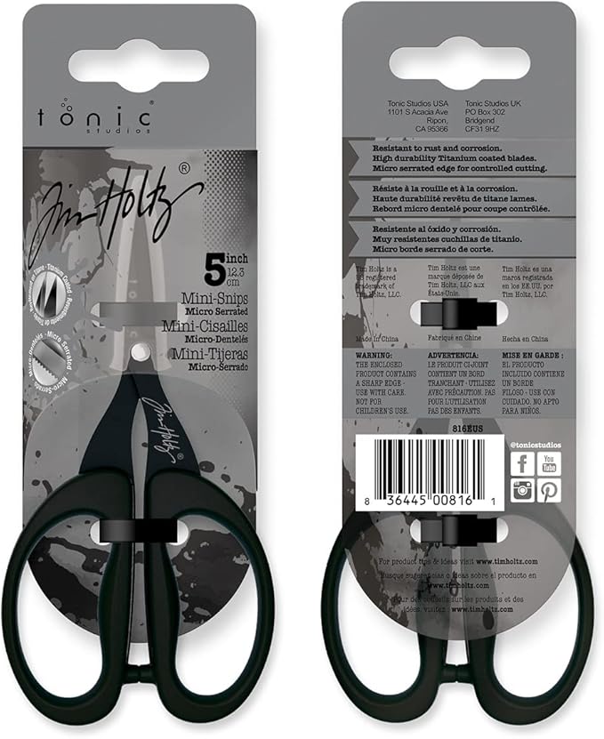 Tim Holtz Small Scissors - 5 Inch Mini Snips with Micro Serrated Blade - Craft Tool for Cutting Paper, Fabric, and Sewing - Titanium with Black Comfort Grip Handles