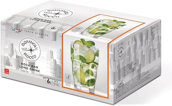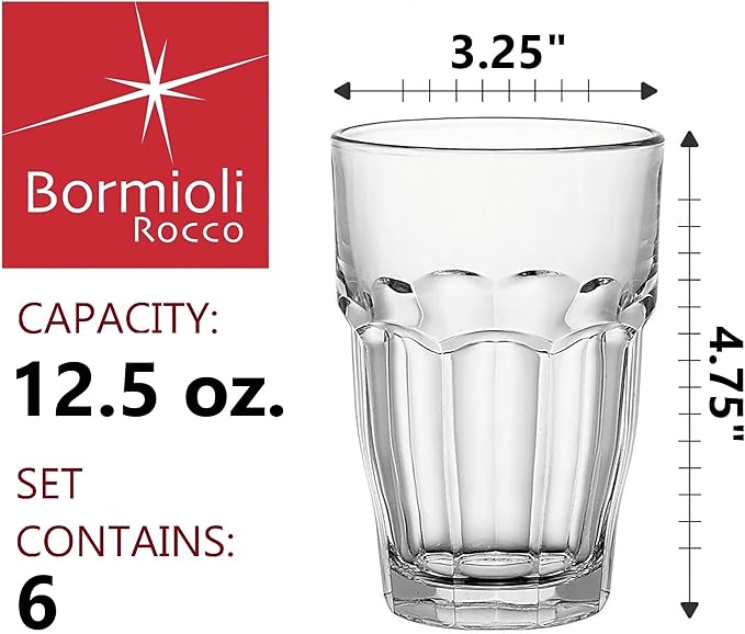 Bormioli Rocco Rock Bar Stackable Beverage, Set Of 6 Dishwasher Safe Drinking Glasses For Soda, Juice, Milk, Coke, Beer, Spirits – 12.5oz Durable Tempered Glass Water Tumblers For Daily Use
