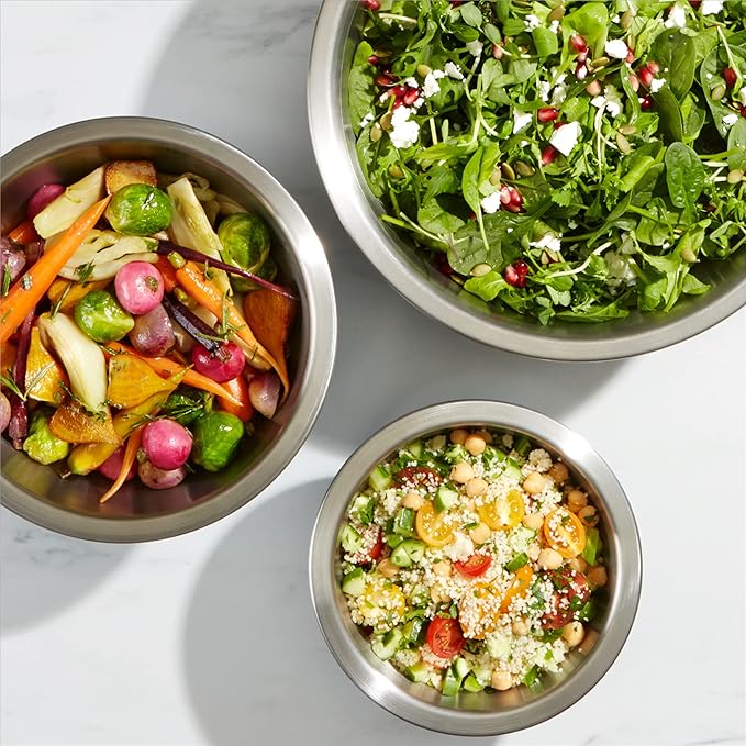 About This Set includes one 1.5-quart, one 3-quart and one 5-quart Stainless Steel Mixing Bowls Stainless steel interior won't stain... Read more