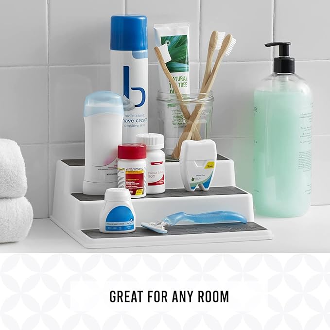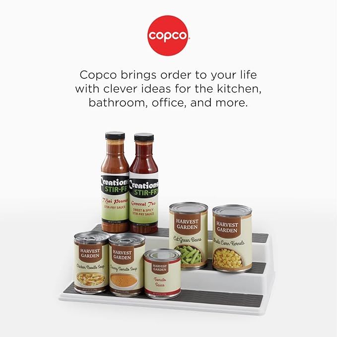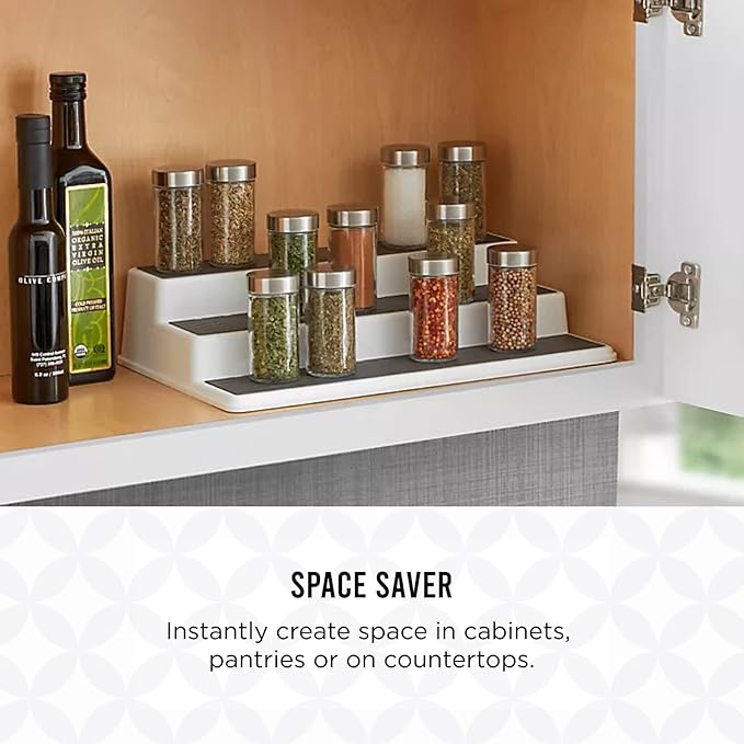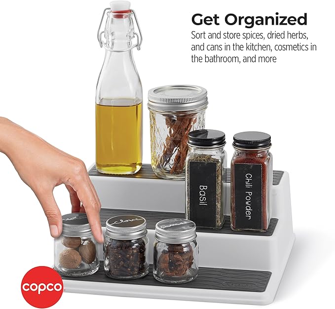 Copco 3-Tier Spice Rack Organizer for Cabinet or Pantry, 10-Inch Non-Skid Tiered Shelf, White/Gray Design Holds Spice Jars, Cans, and Bottles