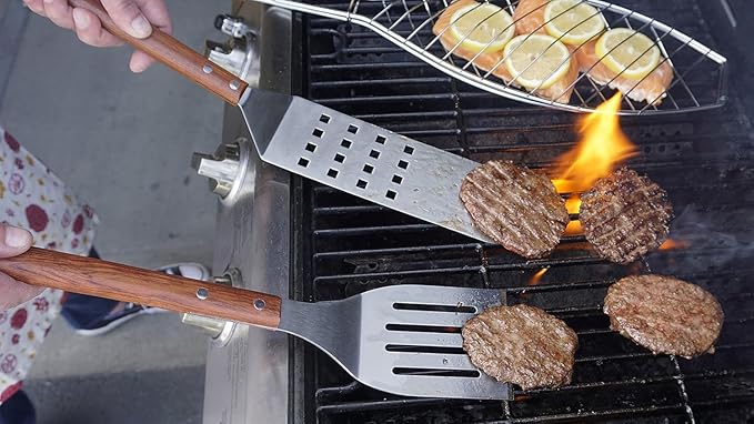 About This STYLISH AND RESTAURANT QUALITY: Made of durable stainless steel and beautiful rosewood on the handle GREAT GRILLING: The... Read more