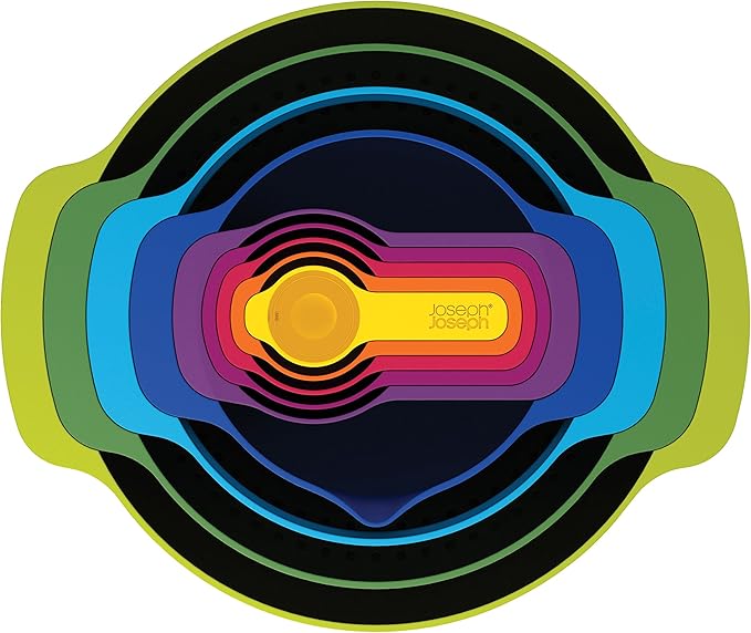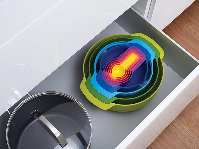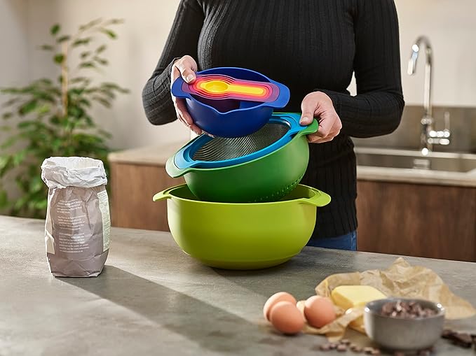 Joseph Joseph Nest 9 Plus, 9 Piece Compact Food Preparation Set with Mixing Bowls, Measuring cups, Sieve and Colander, MultiColor