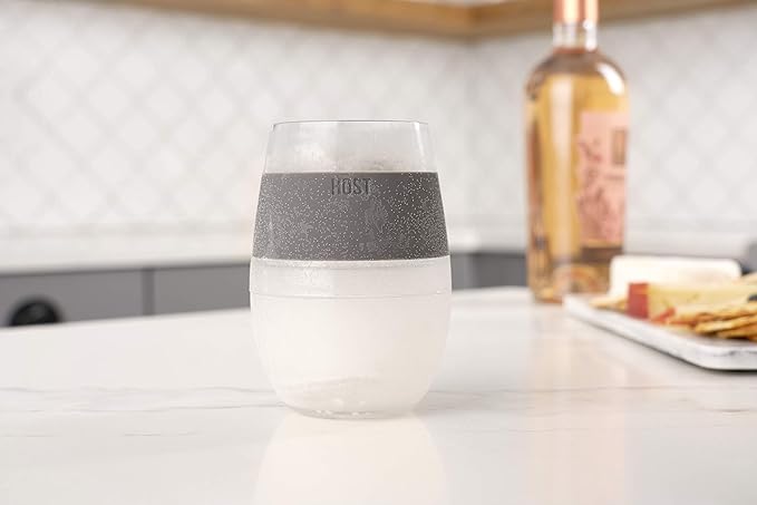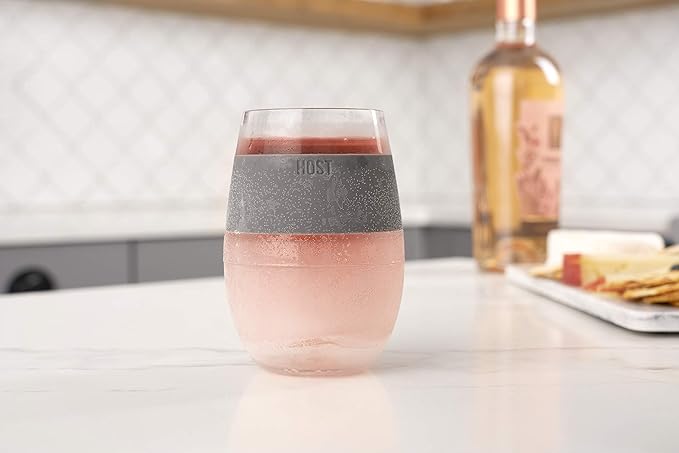 HOST 2962 Freeze Stemless Red & White Wine Tumbler Cups, Insulated Plastic Glass, Set of 2, 8.5 oz, Grey Silicone Bands