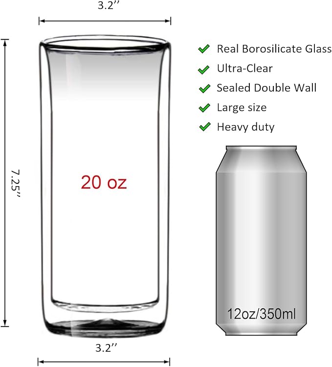 Sun's Tea (Set of 2) 20oz (600ml) Ultra Clear Strong Double Wall Insulated Thermo Glass Tumbler V3 Highball Glass for Beer/cocktail/lemonade/iced Tea/Smoothie (Real Borosilicate Glass, Not Plastic)