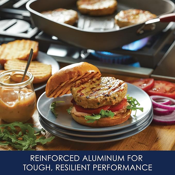 Rachael Ray Cucina Hard-Anodized Nonstick 11-Inch Deep Square Grill Pan, Gray with Cranberry Red Handle - 87632