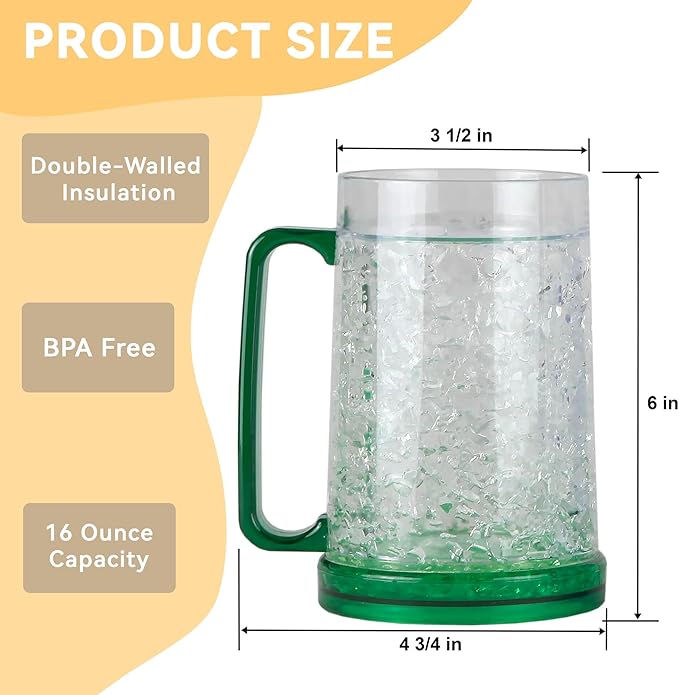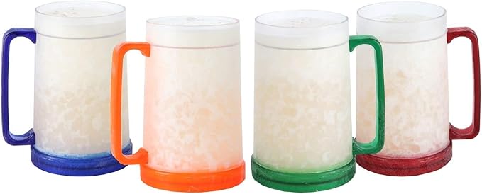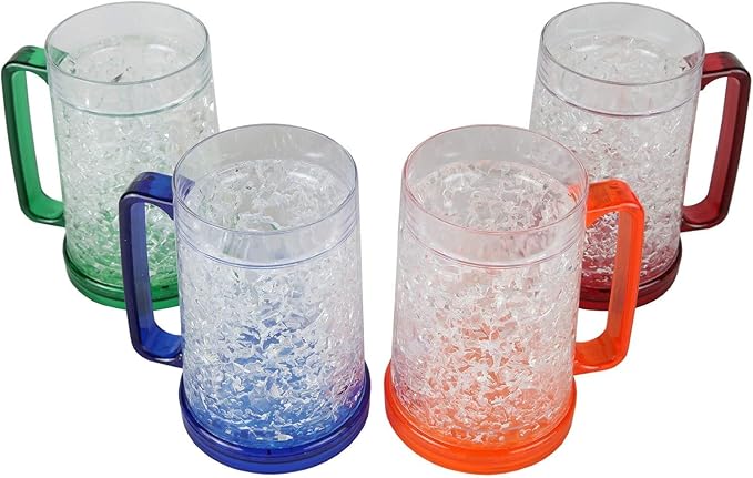 Lily's Home 16oz set of 4 Double Wall Gel-Filled Acrylic Freezer Stein Mugs, Great as Old Fashion Drinking Glasses at BBQs and Parties, Clear with Assorted Color Accents