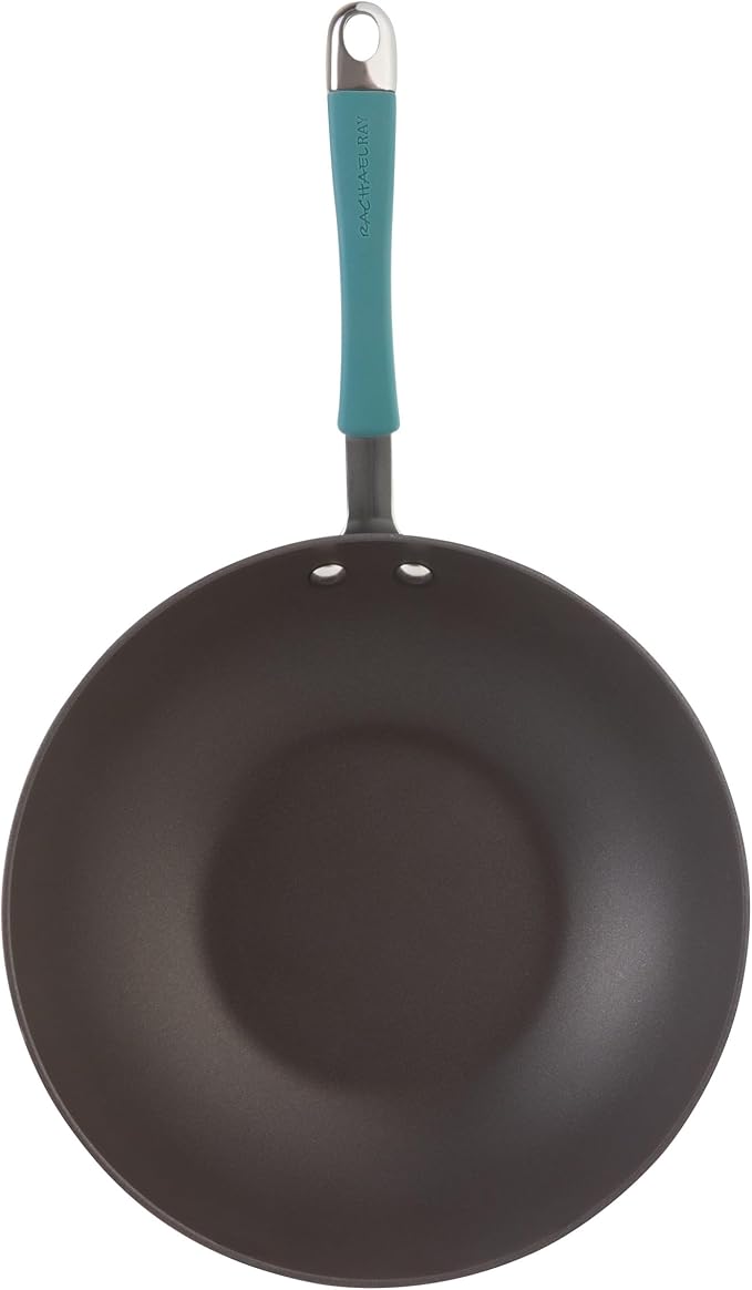 Rachael Ray Cucina Hard-Anodized Nonstick Covered Stir Fry Pan, 11-Inch, Gray, Agave Blue Handles