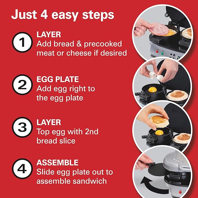 Hamilton Beach Dual Breakfast Sandwich Maker with Timer, Ready in 5 Minutes, Removable Dishwasher Safe PFAS-Free Non-Stick Egg Cooker Ring, Silver (25490MNA)