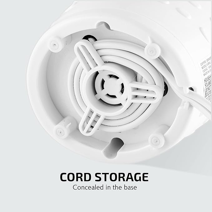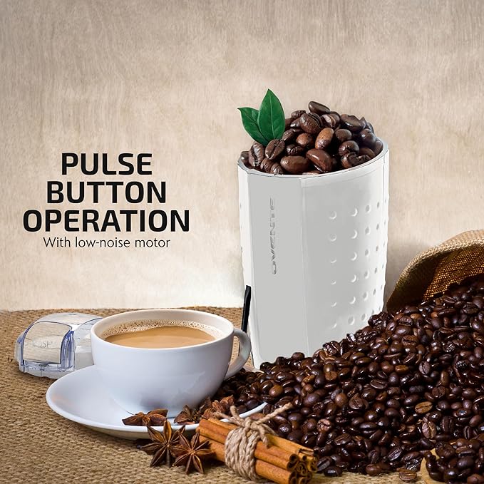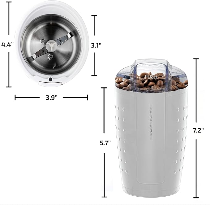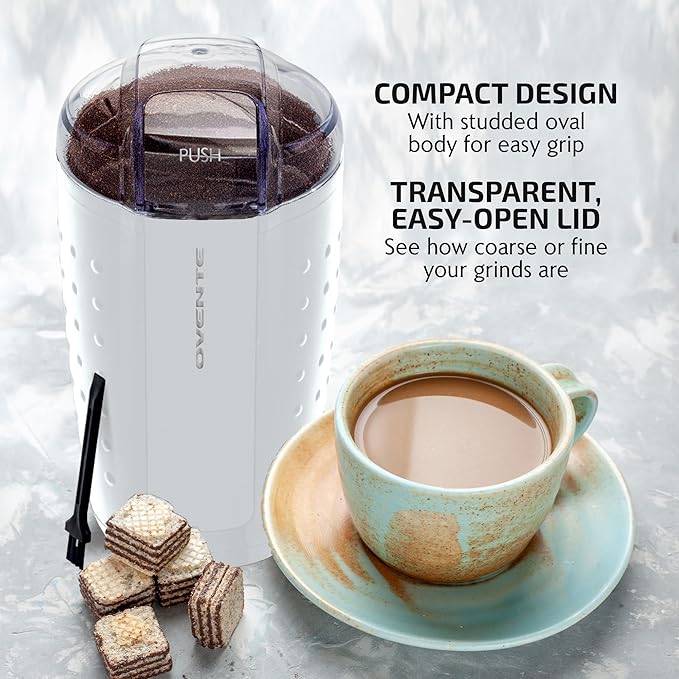 OVENTE Electric Coffee Grinder for Beans, Spices and More, 2.5Oz Compact Grinding Mill, Spice Grinder with Stainless Steel Blade, Pulse Button Operation and Transparent Easy to Open Lid, White CG225W