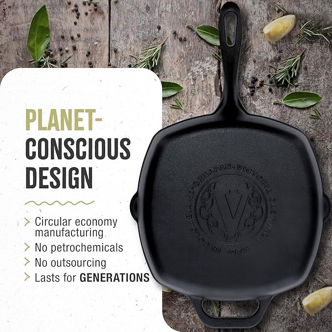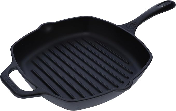 Victoria Cast Iron Grill Pan, Square Grill Pan, Cast Iron Griddle Pan, Seasoned with 100% Kosher-Certified, Non-GMO Flaxseed Oil, Black, 10 Inches