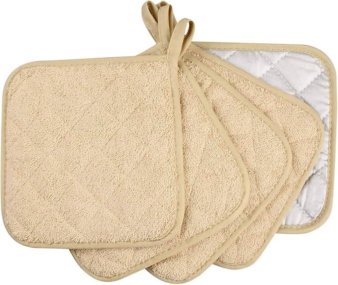 100% Cotton Kitchen Everyday Basic Terry Pot Holder Heat Resistant Coaster Potholder for Cooking and Baking Set of 5 Light Brown