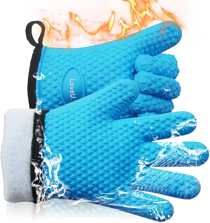 Kitchen Oven Gloves - Dual-Layer Heat Resistant Grilling Gloves, Silicone Oven Mitts with 5 Fingers, Waterproof Non-Slip Pot Holder for Barbecue, Cooking, Baking (XL-XXXL, Blue)
