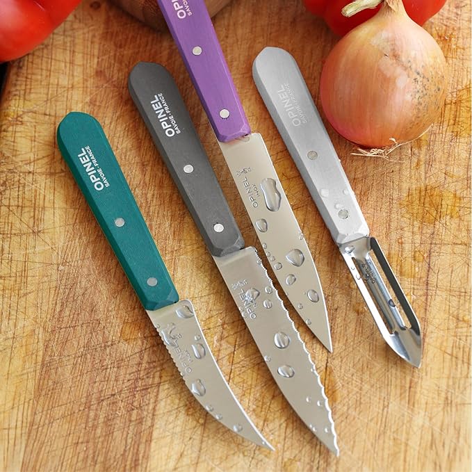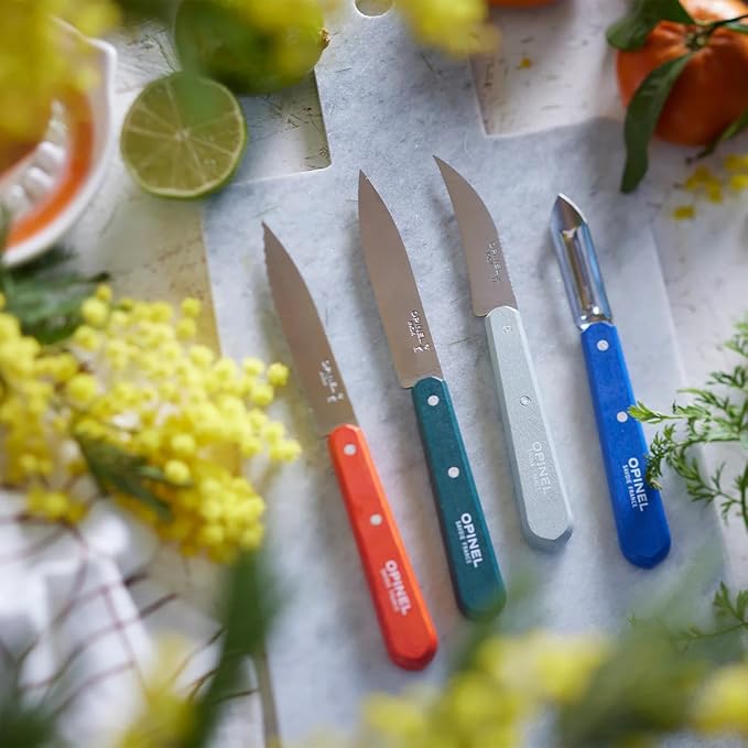 Opinel Les Essentials Small Kitchen 4 Piece Knife Set - Paring Knife, Serrated Knife, Peeler, Vegetable Knife, Corrosion Resistant High Carbon Steel, Made in France (Art Deco)