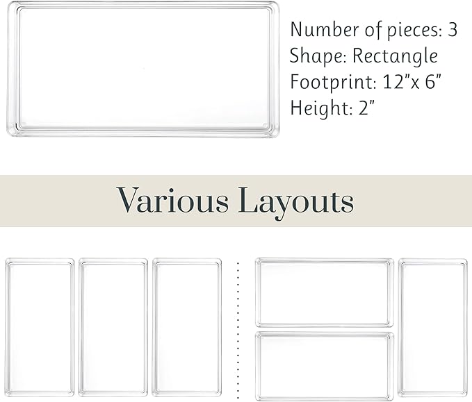 STORi SimpleSort 3-Piece Stackable Clear Drawer Organizer Set | 12" x 6" x 2" Rectangle Trays | Wide Makeup Vanity Storage Bins and Office Desk Drawer Dividers | Made in USA
