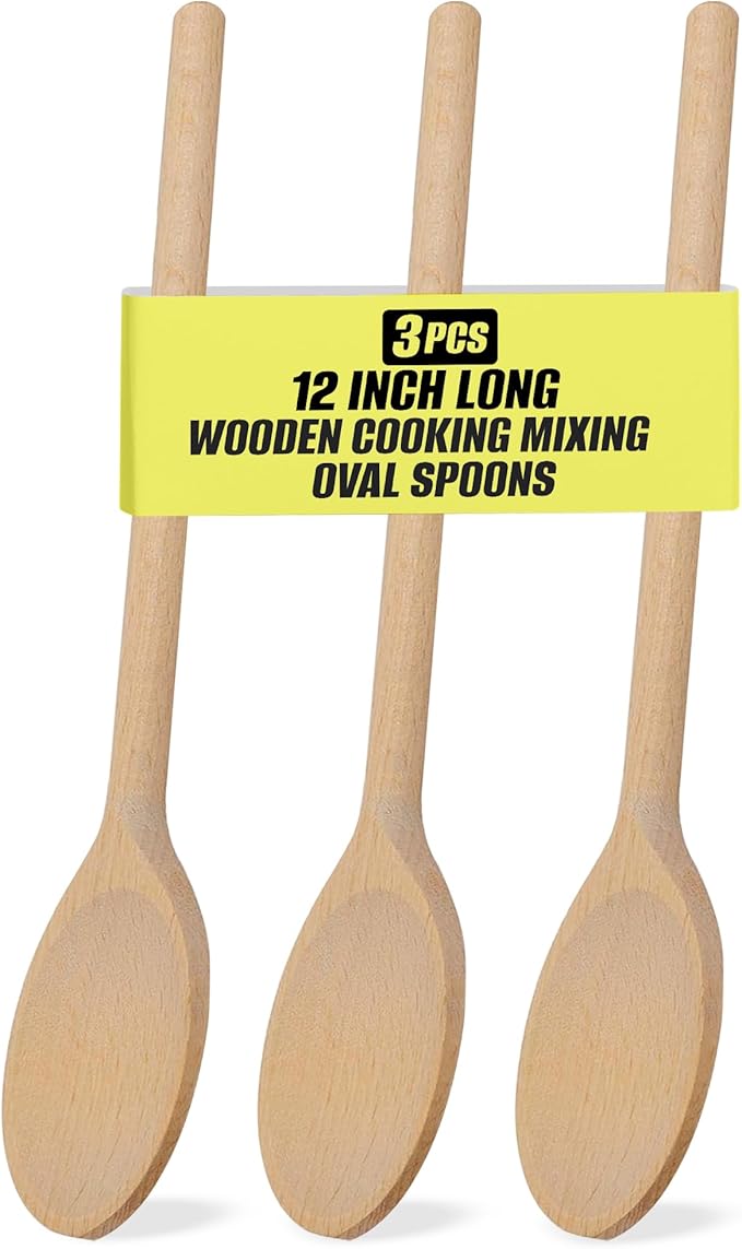 3-PCS 12″ Long Beechwood Wooden Cooking Spoons – Heat-Resistant, Non-Scratch Mixers for Non-Stick Cookware | Sustainably Sourced European Crafting