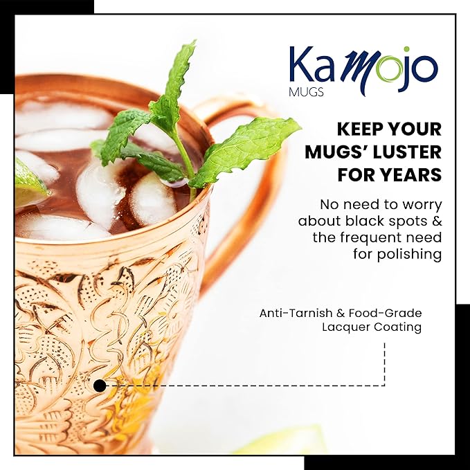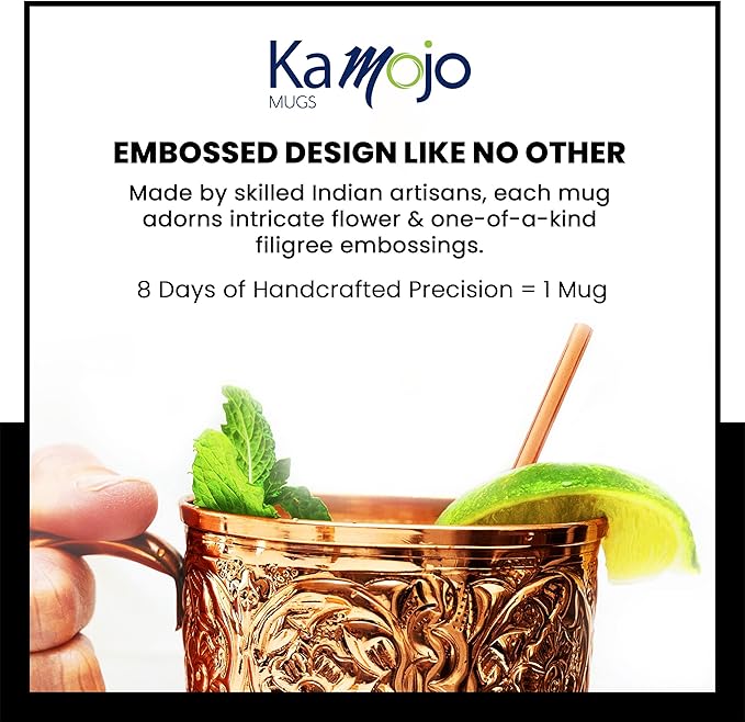 Copper Cups Set of 2 with Unique Handcrafted Embossed Design with Anti-Tarnish Food-Grade Coating - Moscow Mule Copper Mugs Gift Set with 2 Straws & Recipe E-Book, 16 oz