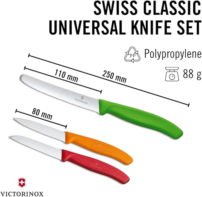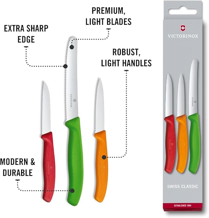 About This Swiss Kitchen Knife Set: This Victorinox knife set includes a wavy-edge paring knife, a straight-edge paring knife, and... Read more