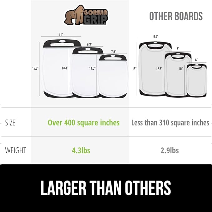 GORILLA GRIP BPA-Free Reversible Kitchen Cutting Board Set of 3, US Designed, Nonporous, Juice Grooves Catch Liquid, Slip Resistant Border, Durable Food Chopping Boards, Holiday Prep Essentials, Black