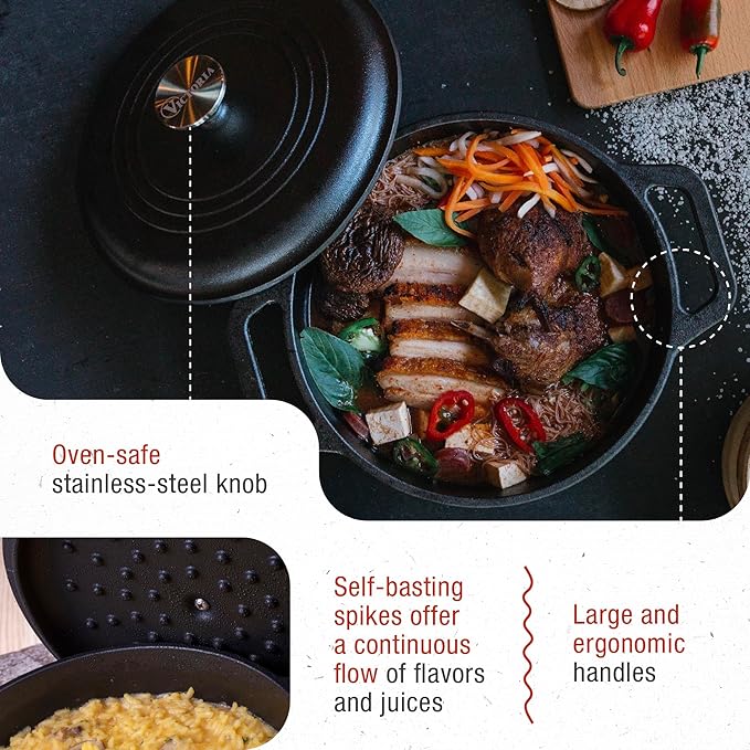 About This CAST IRON COOKING: Our cast iron Dutch oven features a preseasoned skin that builds seasoning with each use... Read more