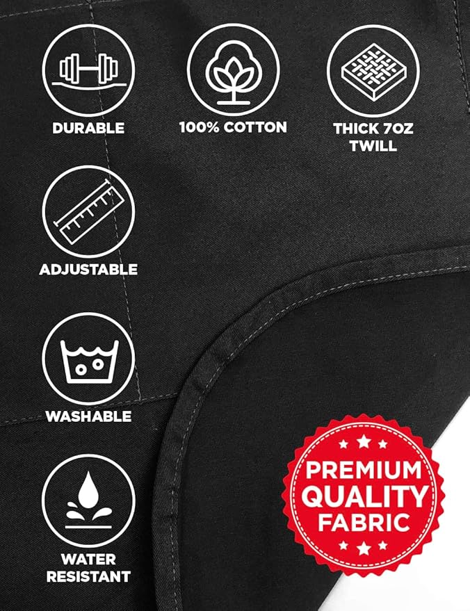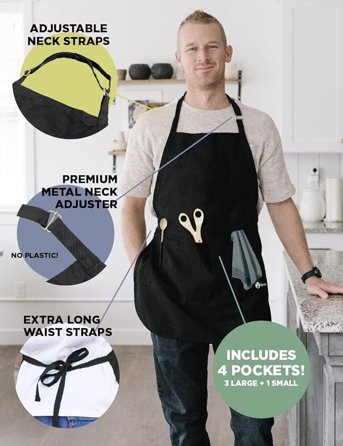 • ADJUSTABLE FIT & SIZE‑RIGHT GUARANTEE - Measures 30″ long by 24″ wide, with adjustable neck strap and extra-long waist ties. Fits adults from roughly 4′1″ to 7′1″ (waist 15″–60″).