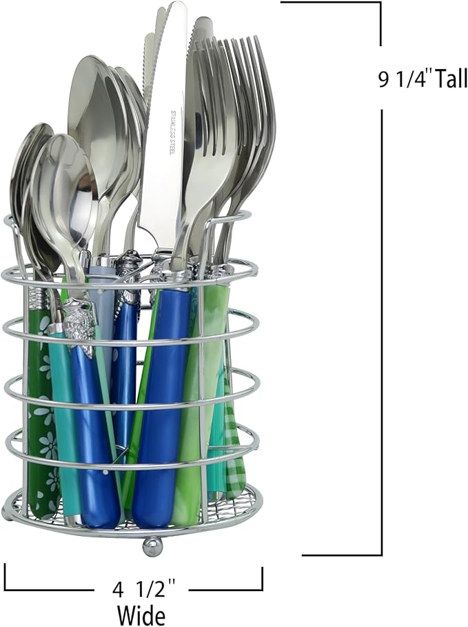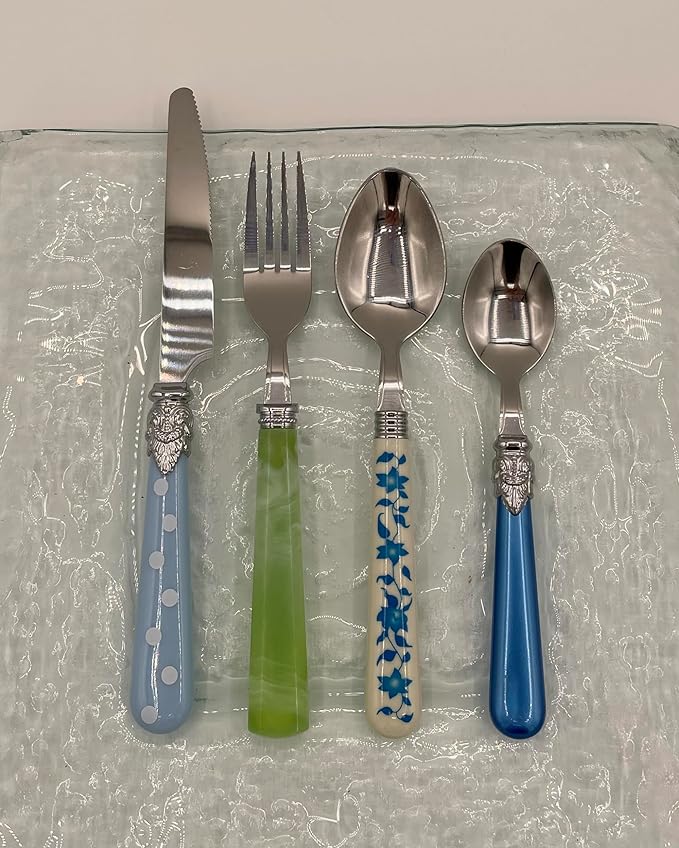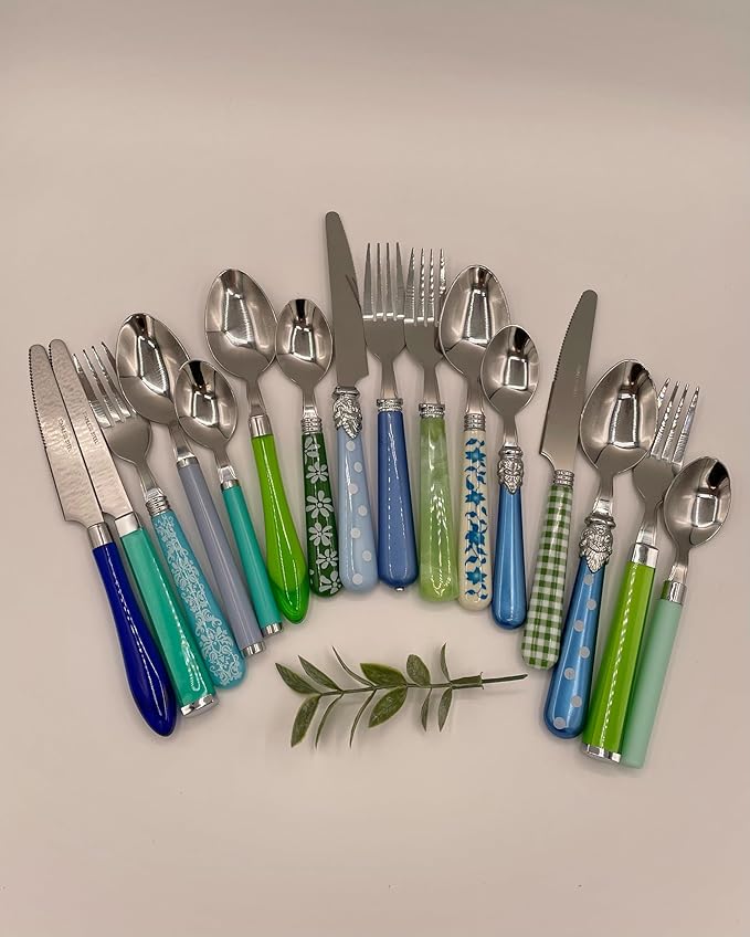 The Original Brink House Eclectic Blue Green Mix & Match Stainless Steel Cutlery Set / 16 pieces with Metal Stand/Lifestyle utensils set for home, first apartment, dorm, dinner parties