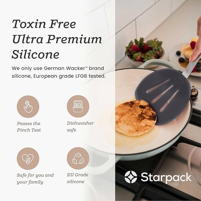 StarPack Premium Flexible Wide Silicone Turner Spatula - High Heat Resistant to 600°F, Hygienic One Piece Design, Non Stick Rubber Kitchen Utensil for Fish, Egg, Pancakes, Cookies & more (Stormy Grey)