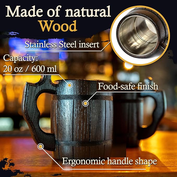 About This Improved mugs for all true beer lovers !!! Handmade oak wood mug accomplished in a dark brown color.... Read more