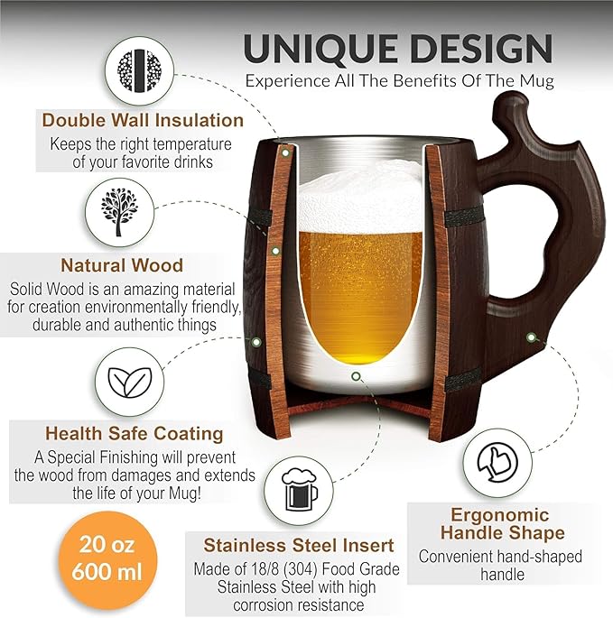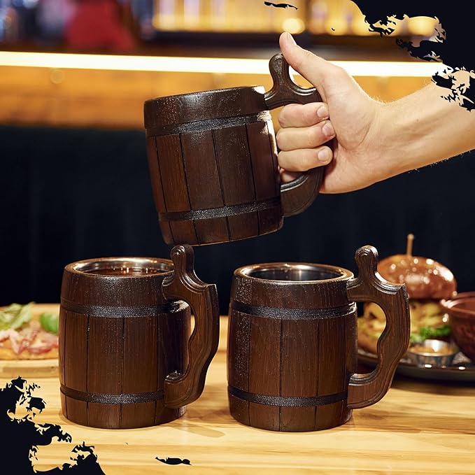 Set of 6 Beer Mug 20 OZ - Tankard Mug - Beer stein - Wooden beer mug - Stainless Steel Cup - Handmade Gifts for Men - Fathers Day, Christmas or Birthday Gift Idea - Barrel Brown