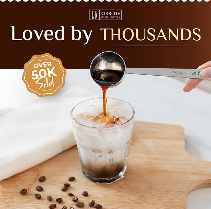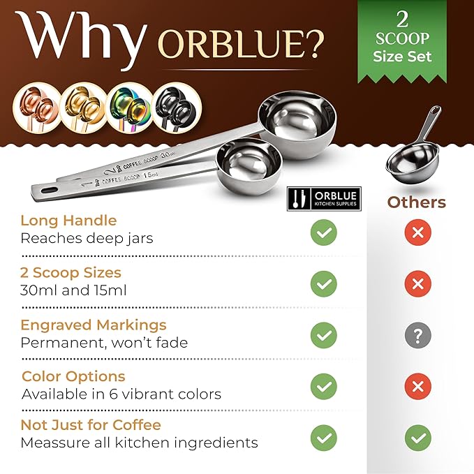 Orblue Premium Coffee Scoop Set - 1 Tbsp (15ml) & 2 Tbsp (30ml) Measuring Tablespoon - Stainless Steel Coffee Measuring Spoon and Scooper with Long Handles - Pack of 2