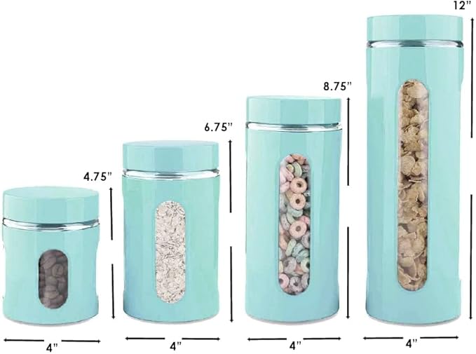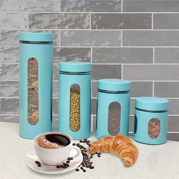 Kitchen Canisters Set For Countertop By Home Basics | Retro-Styled Canisters For Kitchen Counter | Stainless Steel and Glass, See-Through Windows (Turquoise), 4 Pieces