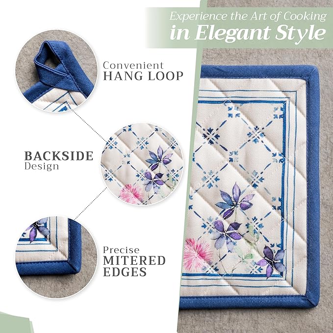 Maison d' Hermine 100% Cotton Oven Mitt & Pot Holder Set (7.5"x13" & 8"x8") Heat Resistant BBQ Cooking Gloves with Loop, Baking, Grilling, Kitchen, Handling Hot Pans Spring/Summer (Faience)