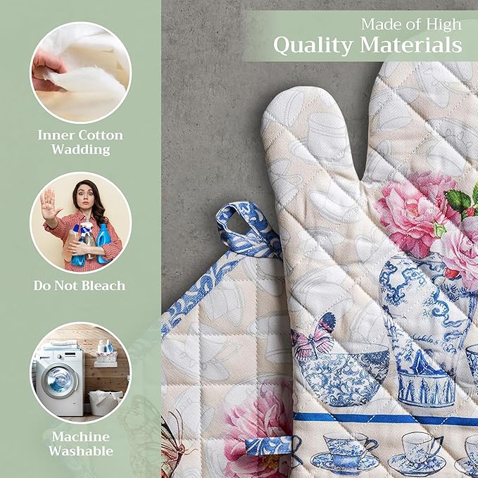 Maison d' Hermine 100% Cotton Oven Mitt & Pot Holder Set (7.5"x13" & 8"x8") Heat Resistant BBQ Cooking Gloves with Loop, Baking, Grilling, Kitchen, Handling Hot Pans Spring/Summer (Canton)