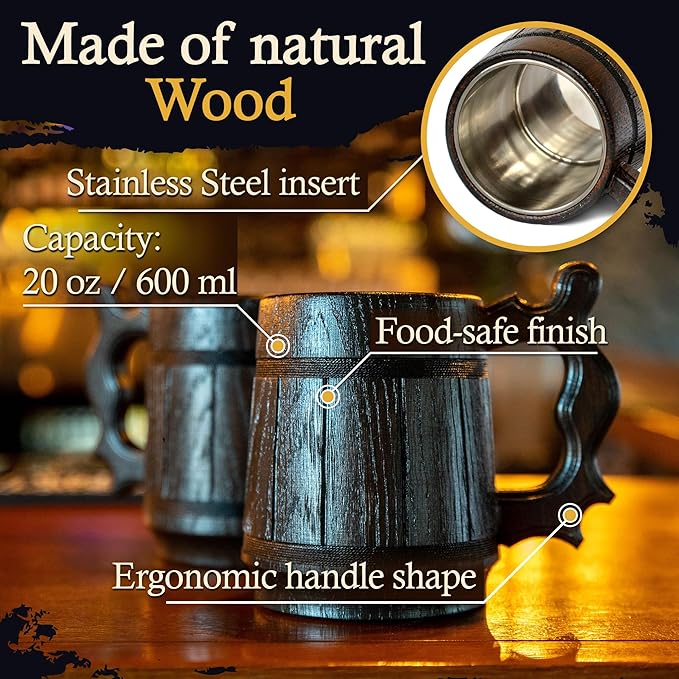 Set of 6 Beer Mug 20 OZ - Tankard Mug - Beer stein - Wooden beer mug - Stainless Steel Cup - Handmade Gifts for Men - Fathers Day, Christmas or Birthday Gift Idea - Retro Brown