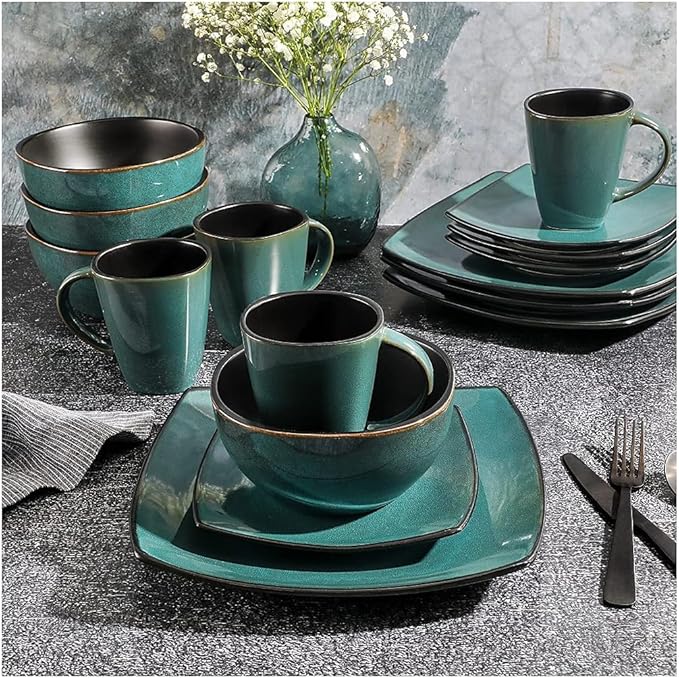 Gibson Elite Soho Lounge 16 Piece Reactive Glaze Dinnerware Set, Soft Square, Teal Green, Service for 4 (16pc)