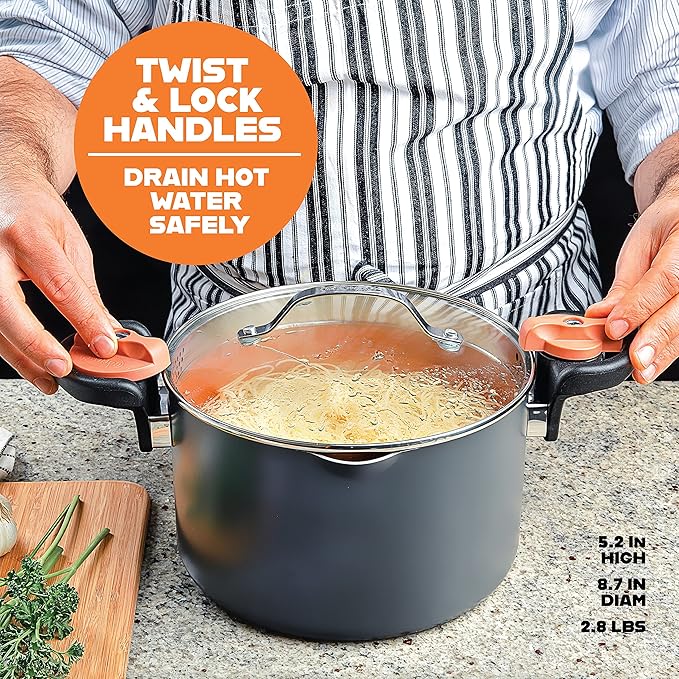 Gotham Steel 5 Quart Stock Pot Multipurpose Pasta Pot with Strainer Lid & Twist and Lock Handles, Nonstick Ceramic Surface Makes for Effortless Cleanup with Tempered Glass Lid, Dishwasher Safe