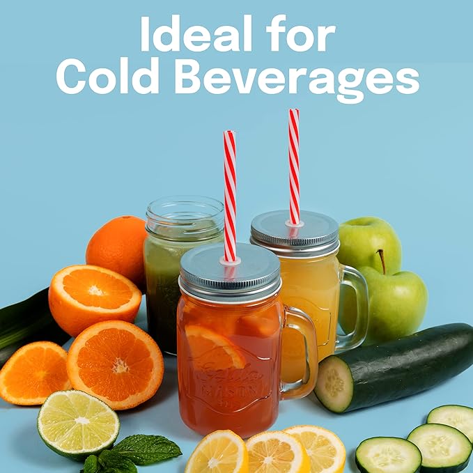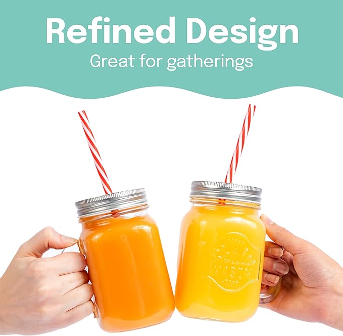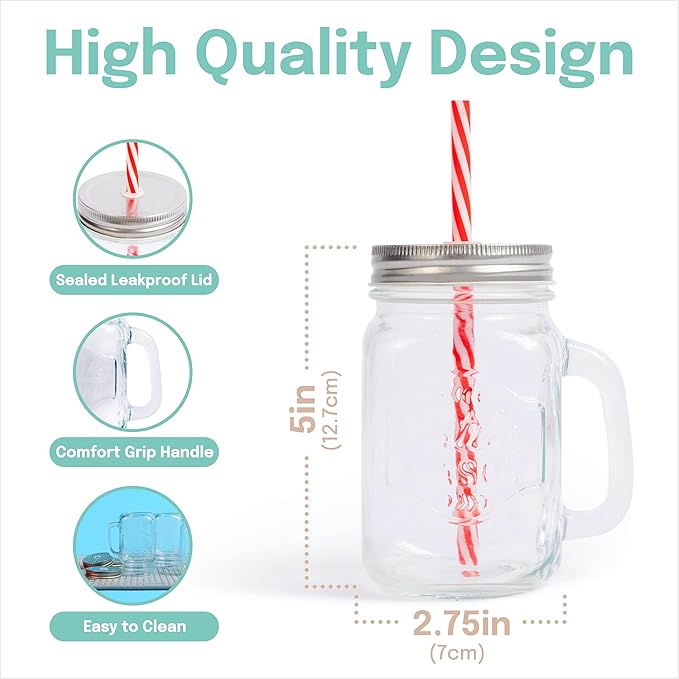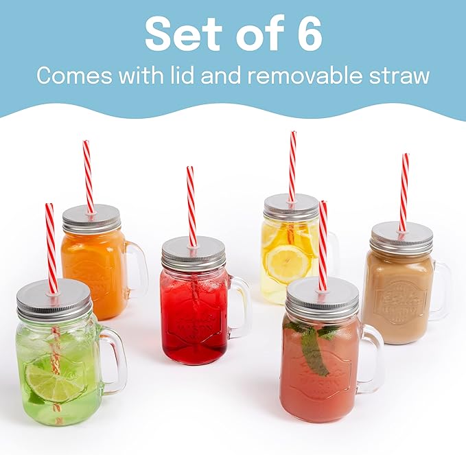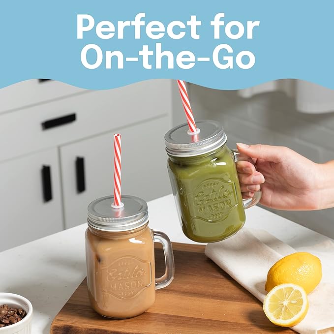 Estilo Glass Mason Jars with Handles, Lid and Straw 16 oz | Drinking Glasses Cups Mug Set for Iced Coffee, Tea & Smoothie - Set of 6