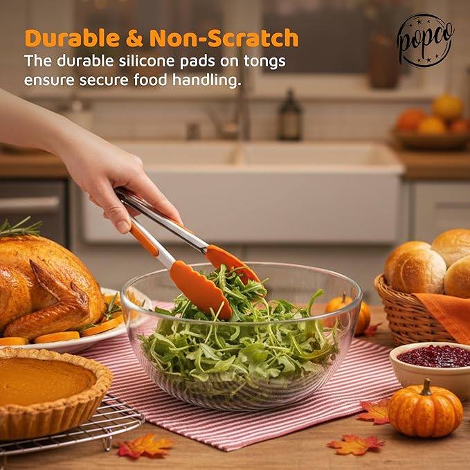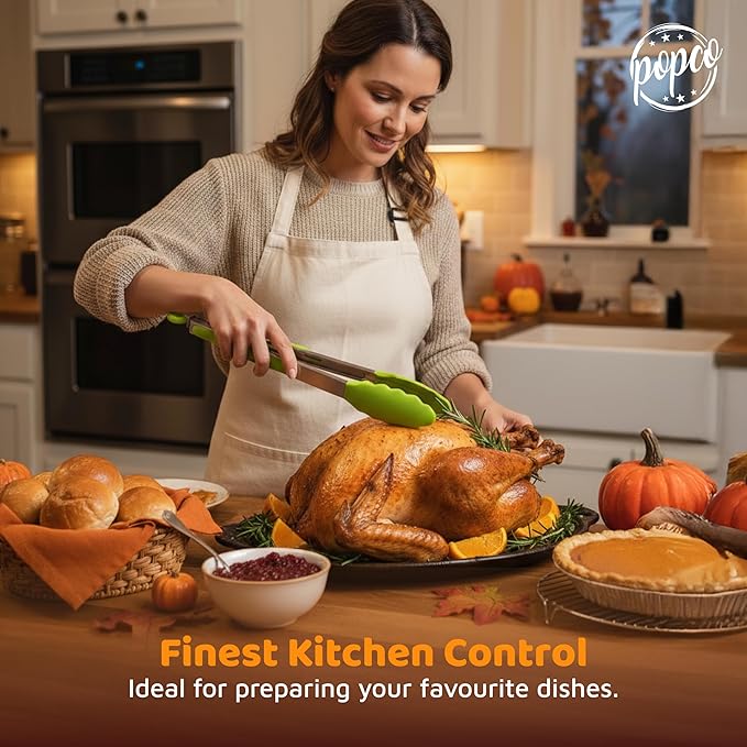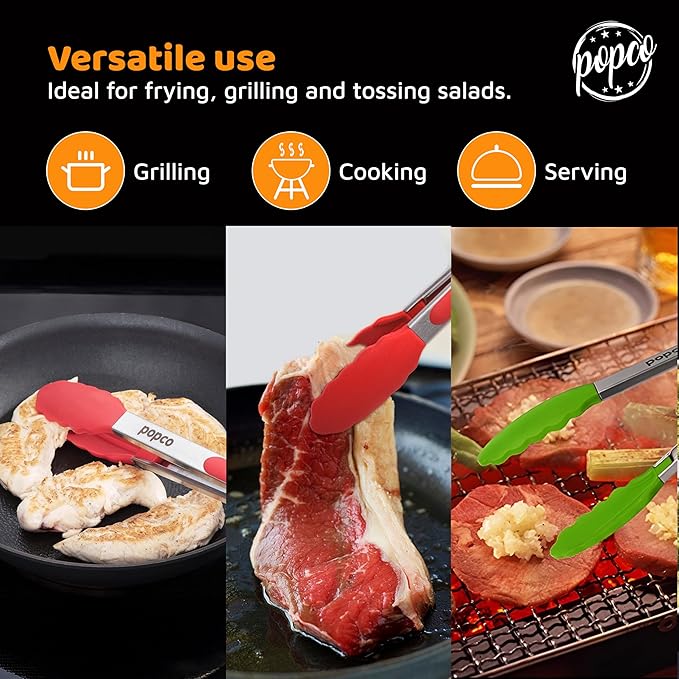 Popco 3 Piece Kitchen Tongs Set 7, 9, 12 Inch - Stainless Steel Nonstick Tongs with Silicone Tips - Heat Resistant and Dishwasher Safe for Cooking, Grilling, Salad, and Everyday Serving