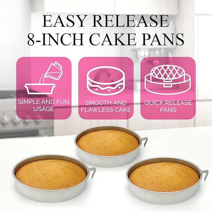 Aunt Shannon's Kitchen 8 Inch Round Cake Pans, 3 Pack, Silver Cake Pan with a Built-in Swivel Blade, Easy Release Cake Pans Set for Baking, Baking Pans Set for 3-Layer Cake, Dishwasher Safe