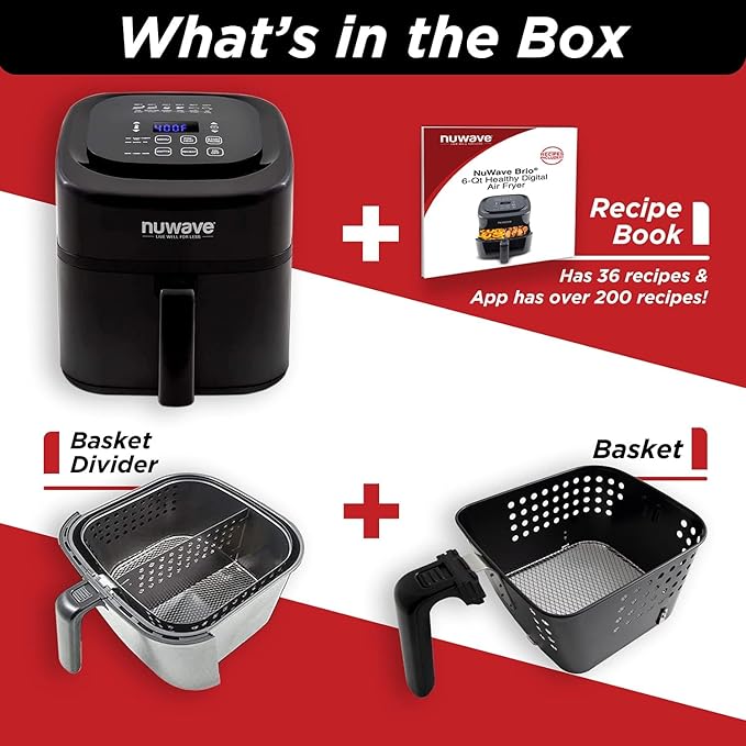 Nuwave Brio 6-Quart Digital Air Fryer Including Non-Stick Baking Pan and Stainless-Steel Cooking Rack (6-Quart + Gourmet Kit), Black