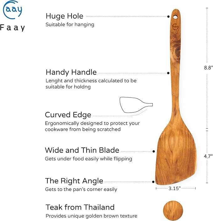 FAAY 13.5” Right-Hand Stir Fry Spatula – Thin Edge Teak Wooden Turner for Wok & Nonstick Pans, Natural Coconut Oil Finish, Handcrafted Wood Tool for Stirring & Flipping