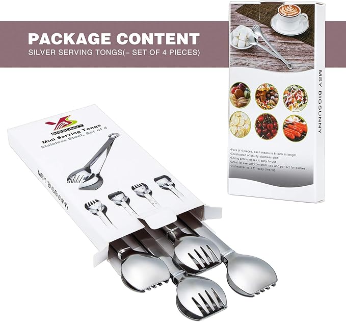 Mini Appetizer Tongs Stainless Steel Set of 4, MSY BIGSUNNY Small Serving Tongs, 6 Inch(15.2cm, Silver)