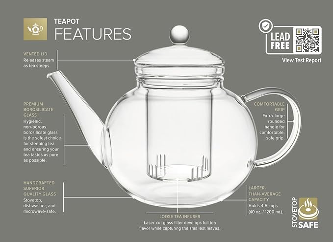 Teabloom Stovetop & Microwave Safe Glass Teapot with Removable Loose Tea Glass Infuser – Includes 2 Blooming Teas – 2-in-1 Tea Kettle and Tea Maker – Tea Purist's Choice
