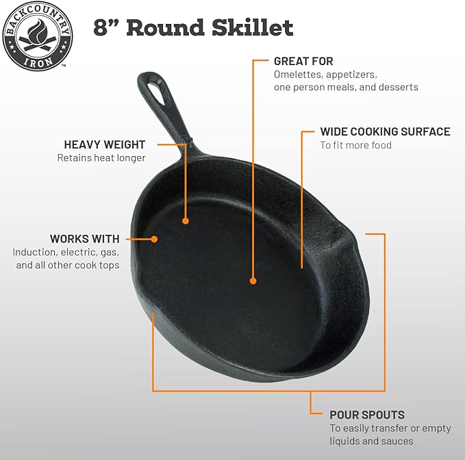 About This Backcountry Iron’s 8 inch round cast iron has superior heat retention for even cooking. This skillet comes pre... Read more