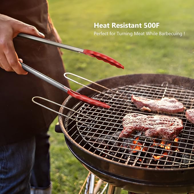 Set of 2 Kitchen Tongs 9-Inch & 12-Inch, Premium Stainless Steel BPA Free Silicone Non-Stick Grilling Barbeque Cooking Locking Food Tongs, Red
