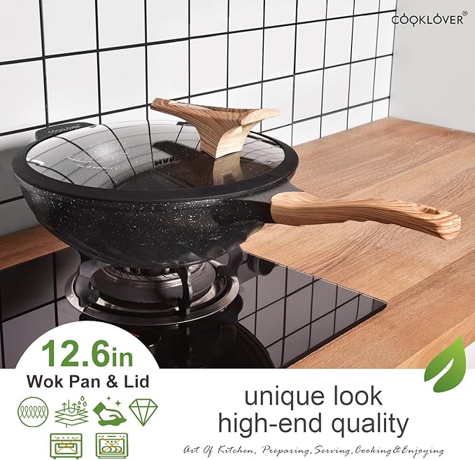 COOKLOVER Nonstick Woks And Stir Fry Pans Die-cast Aluminum Scratch Resistant 100% PFOA Free Induction Wok pan with Lid 12.6 Inch - Black