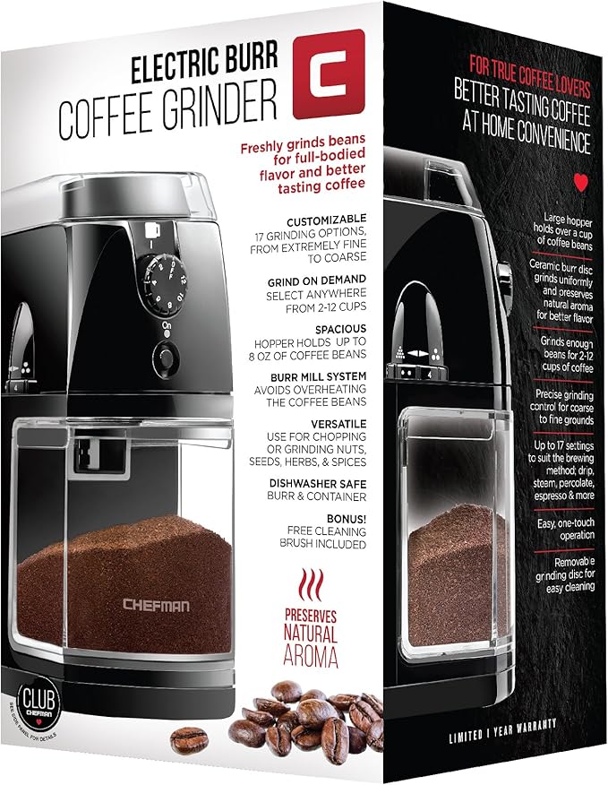Chefman Coffee Grinder Electric Burr Mill - Freshly Grinds Up to 2.8oz Beans, Large Hopper with 17 Grinding Options for 2-12 Cups, Easy One Touch Operation, Cleaning Brush Included, Black