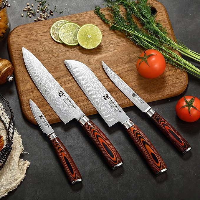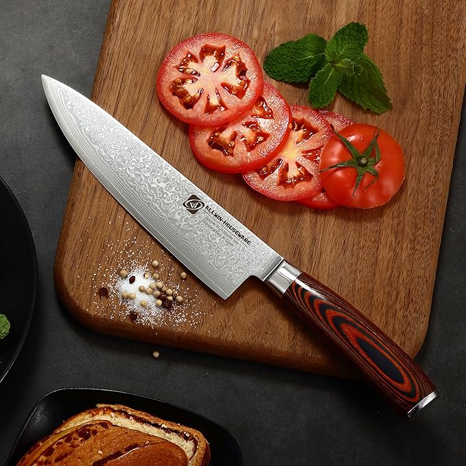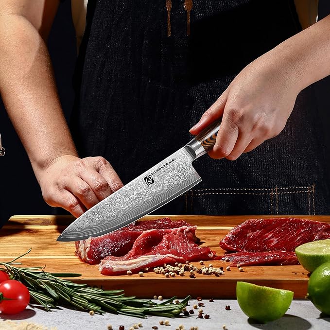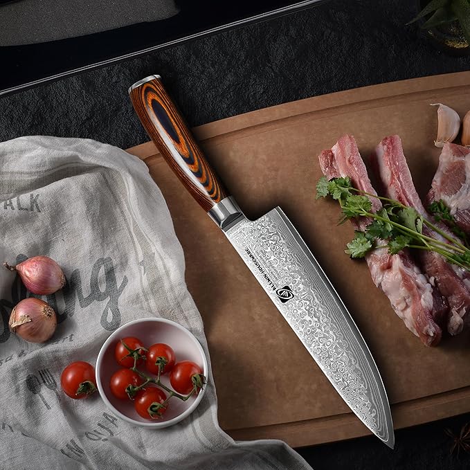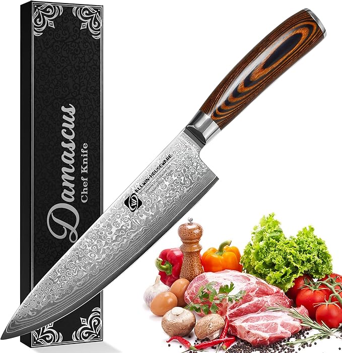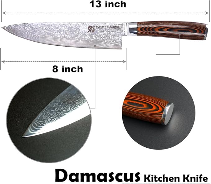 About This 【PREMIUM 67-LAYER DAMASCUS CONSTRUCTION】This 8-inch chef knife features a 67-layer Damascus cladding over a VG10 steel core. This... Read more