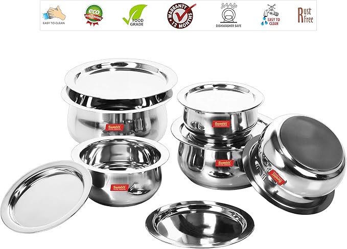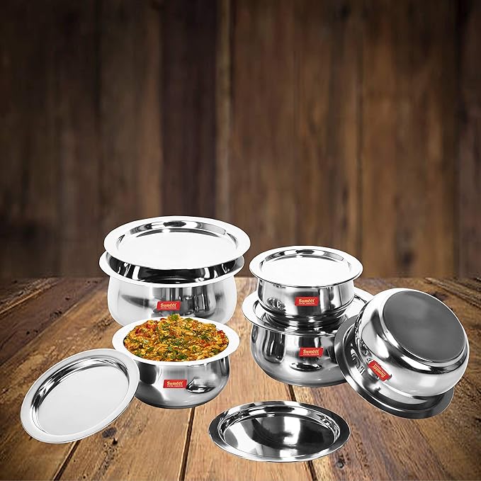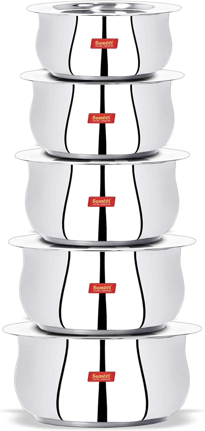 Sumeet 5 Pcs Stainless Steel Induction & Gas Stove Friendly Belly Shape Container Set/Tope/Cookware Set With Lids Size No.10 & No.14
